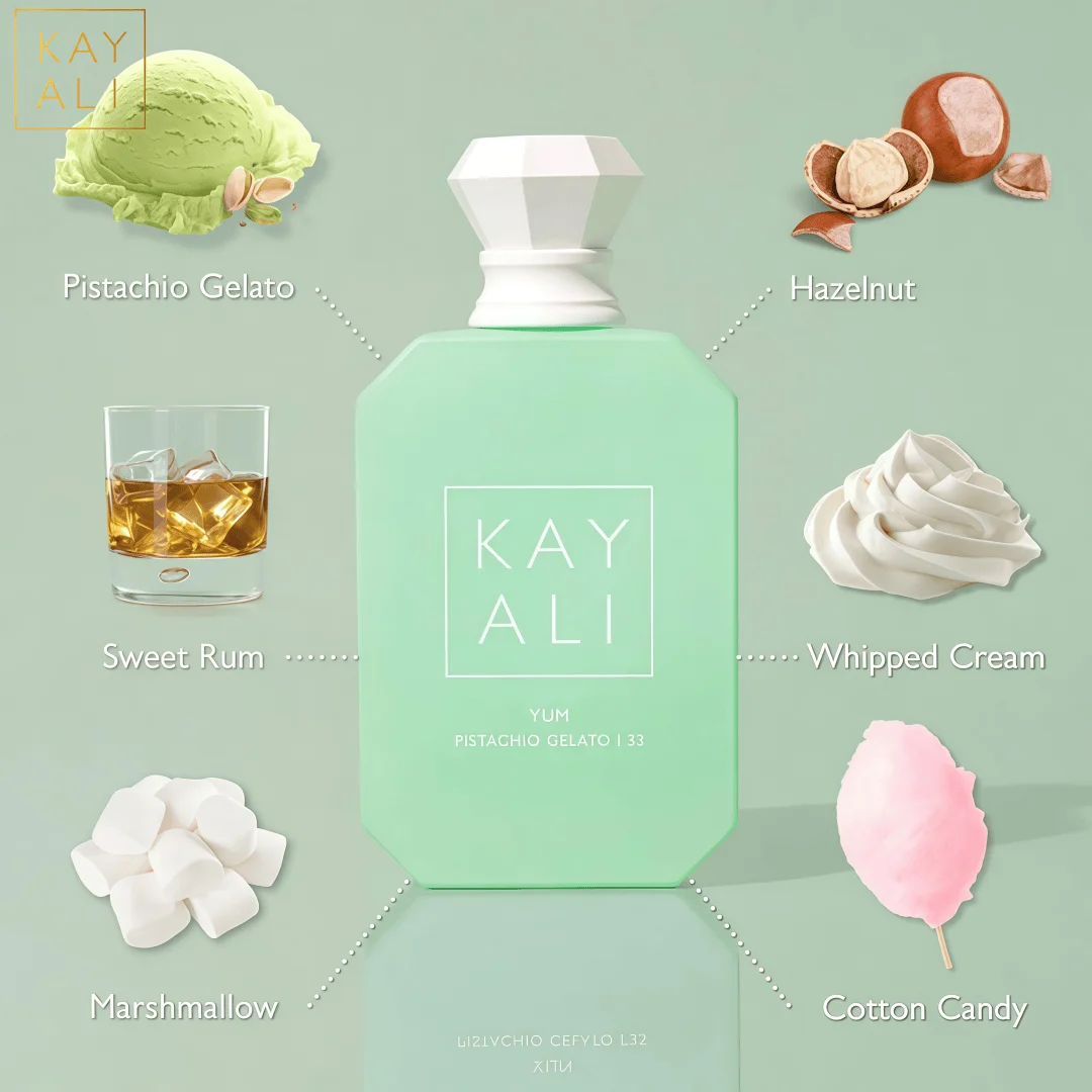 The top notes are pistachio, ice cream, bergamot, hazelnut, rum, and cardamom; the heart notes are lily of the valley, pear, jasmine, peony, geranium, white peach, and raspberry; the base notes are whipped cream, marshmallow, cotton candy, tonka bean, loukhoum, sandalwood, cedar, and cocoa
